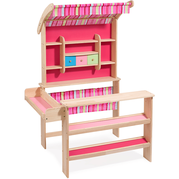Dieser Kaufladen aus massivem Holz mit toller Markise lässt jedes Kinderherz