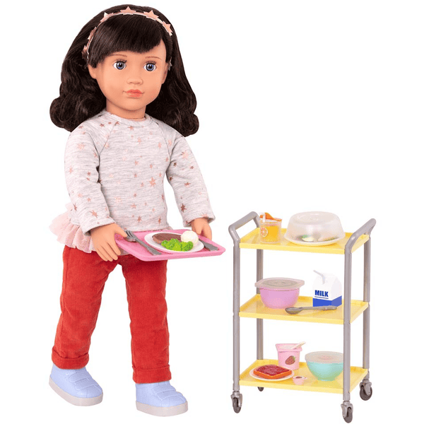 Deine Puppen von Our Generation sind krank oder einfach traurig? Dann kannst du sie doch mit einem leckeren Essen wieder aufheitern! Ob Frühstück, Mittagessen oder Abendessen – dir fällt bestimmt etwas Tolles ein, das deinen Freunden wieder ein Lächeln aufs Gesicht zaubert. Ein Glas Orangensaft sorgt außerdem für die nötigen Vitamine, damit sie ganz schnell wieder glücklich und gesund werden. Und natürlich darf auch ein leckerer Nachtisch nicht fehlen! Guten Appetit! Inhalt: 1 Tablett, 1 Abendessen, 1 Abdeckhaube, 2 Sandwichhälften, 1 Set Gurkenscheiben, 1 Milchkarton, 1 Suppenschüssel mit Deckel, 1 Teller Haferbrei mit Deckel, 1 Joghurtbecher mit Löffel, 1 Becher Orangensaft mit Strohhalm, 2 große Teller, 1 kleiner Teller, 1 Toast mit Konfitüre, 1 Glas Erdbeerkonfitüre, 1 Gabel, 1 Messer, 1 Löffel Größe Produkt (cm): x x Größe Verpackung (cm): 34,29 x 25,4 x 5,08