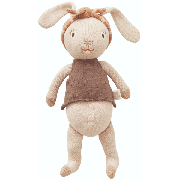 Jolien Rabbit ist ein gestricktes Kaninchen, das mit einem Kleidchen und einem Stirnband ausgestattet ist. Jolien ist aus Baumwolle und hat eine weiche Polyester-Füllung, so dass sie schön weich ist und zum Kuscheln einlädt – sie wird bestimmt der neue beste Freund des Kindes.