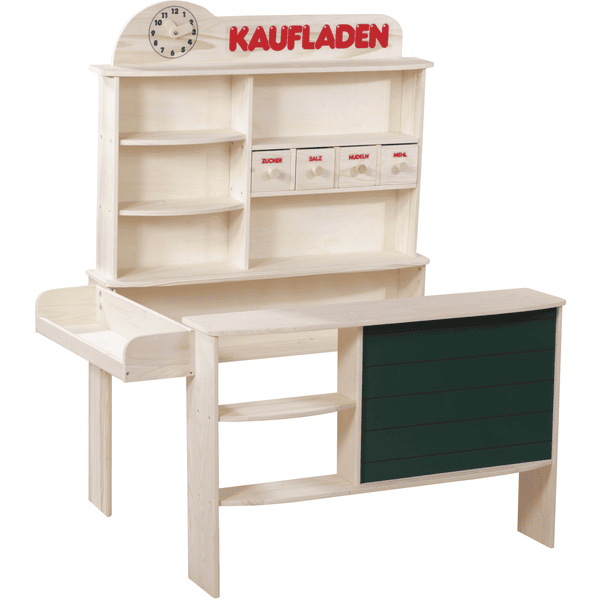 - Inhalt: Verkaufsstand, Uhr mit beweglichen Zeigern, mit integrierter Tafel, 4 Holzschubladen und seitlicher Ablage