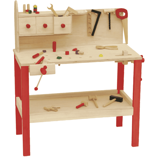 mit dieser kindgerechten großen Werkbank aus Holz. Die Spielwerkbank mit ihrem